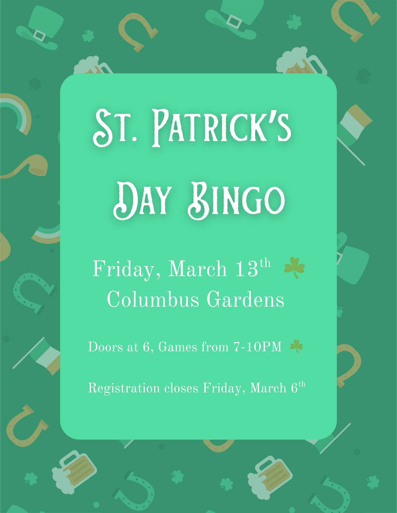 Help us celebrate St. Patrick's Day with BINGO at Columbus Gardens (4301 Klosterman Avenue, Nottingham MD) on Friday, March 13th! Doors open at 6pm, games start at 7pm.